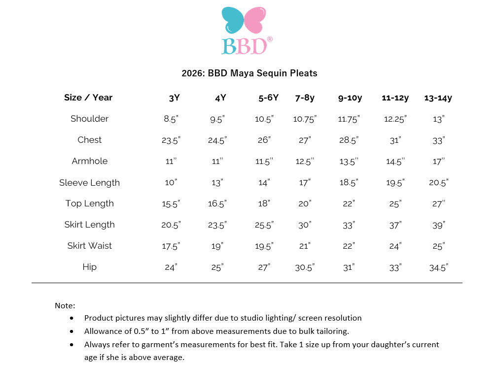- It is best for mothers to ensure the right measurement for best fit your daughters as exchange of size may be difficult during peak season.