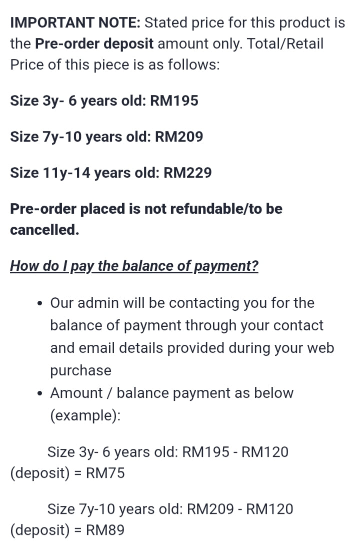 Size 3y- 6 years old: RM195 - RM120 (deposit) = RM75